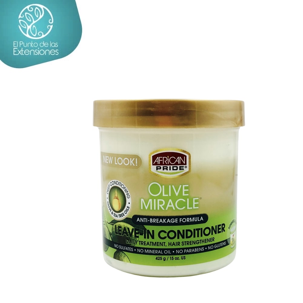 El leave-in acondicionador de la línea Milagro de Oliva de African Pride fortalece el cabello desde el interior proporcionándole una apariencia fuerte y saludable y añade protección antes del secado en lluvia. Su textura ligera se absorbe con rapidez sin dejar sensación grasa. Elaborado con ingredientes naturales como aceite de oliva para estimular el crecimiento y prevenir la caída fortaleciendo el folículo capilar y aceite de árbol de té para prevenir infecciones que conllevan a la pérdida de cabello gracias a los componentes activos de terpenoides y aceites esenciales. Fórmula libre de sulfatos, parabenos, gluten ni aceites minerales.