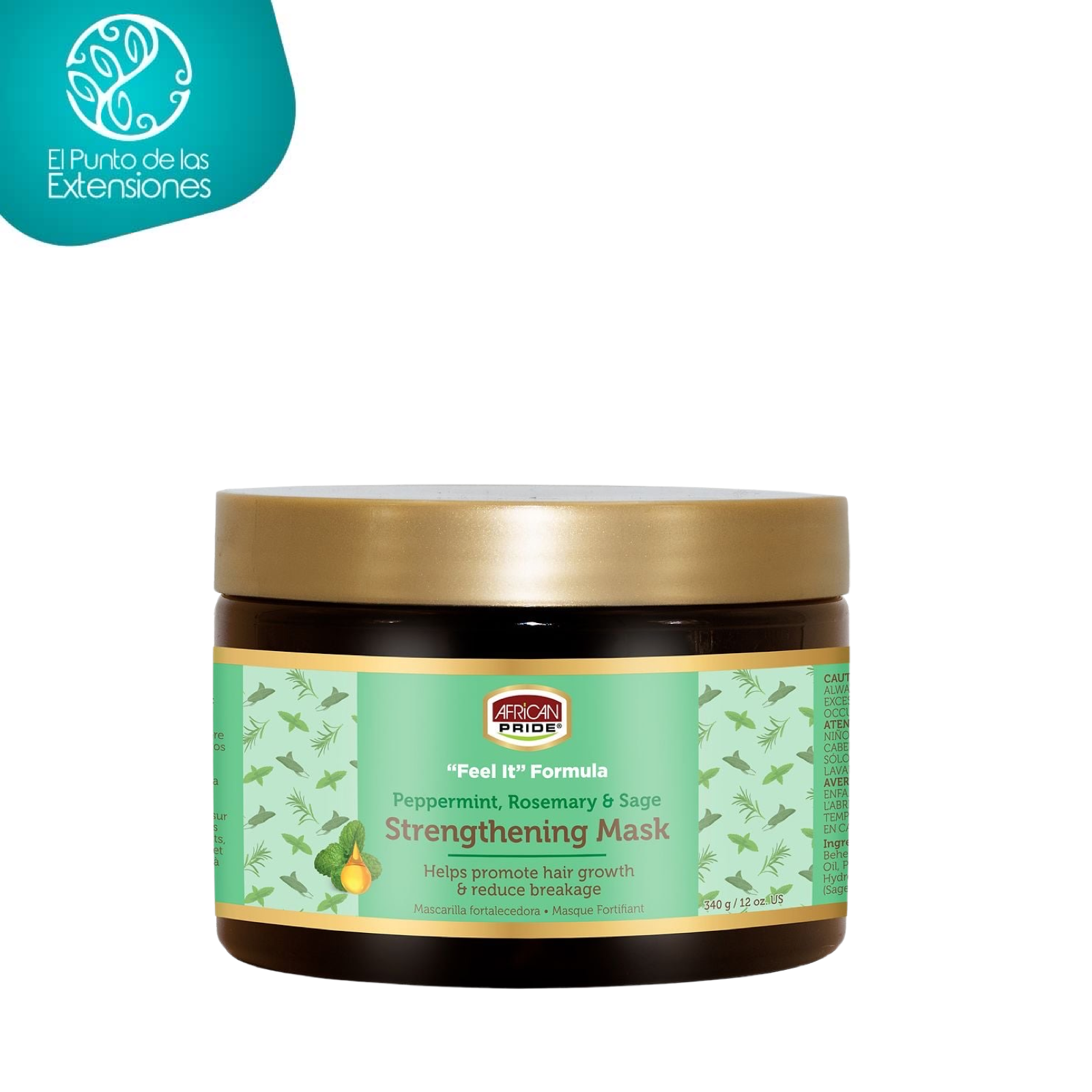La mascarilla de la línea ”Feel It” de African Pride promueve reparación intensa mientras humecta profundamente cabellos secos, con daños y propensos a la rotura. Funciona como mascarilla profunda. Elaborado con ingredientes de origen natural como menta para prevenir la producción de caspa y a fortalecer el folículo, romero para ayudar al rejuvenecimiento y fortalecimiento de la hebra y óleo de salvia para estimular la piel cabelluda. Fórmula libre de sulfatos, parabenos, gluten ni aceites minerales.