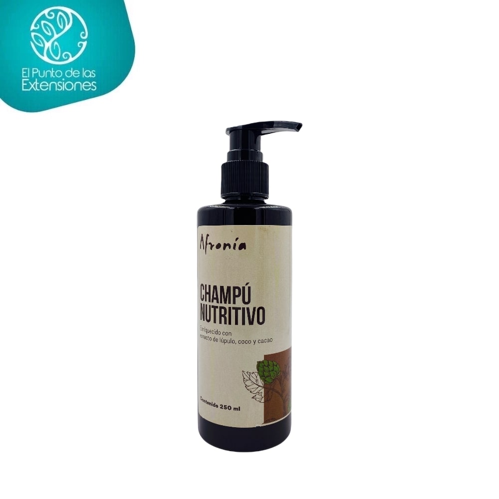 El champú nutritivo de Afronía limpia, revitaliza y nutre pieles cabelludas mixtas a secas. Permite equilibrar y regular la producción natural de sebo. Elaborado con ingredientes a partir de plantas, semillas, frutos y aceites naturales como: con extracto de lúpulo (femeninas de Humulus lupulus) como regenerador capilar para mejorar la salud de la piel cabelluda combatiendo la caspa y la hebra capilar, aceite de coco para aportar brillo y suavidad y extracto de cacao para aumentar la circulación sanguínea y fomentar la salud del cabello al ser rico en vitamina E y magnesio. Fórmula sin fenoxietanol, petroquímicos, siliconas, aceites minerales, perfumes, parabenos y sal. Producto cruelty free, no testado en animales. Hecho en Colombia.