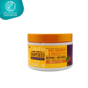 La crema reparadora leave-in Cantu con aceite de semilla de uva actúa profundamente reparando y restaurando el cabello secos y frágiles. Su uso diario promueve la salud y fortalece la hebra evitando a futuro las puntas abiertas y la rotura, dejando brillo en cada aplicación. Ideal para todo tipo de cabellos texturizados. Elaborado con ingredientes naturales como aceite de semilla de uva para ayudar a remover caspa o piel muerta causada por la sequedad en la piel cabelluda, manteca de karité para hidratar profundamente y proteger el cabello de daños causados en procesos químicos, kiwi para regenerar la hebra gracias a contenido en vitamina C antioxidante favoreciendo la formación de colágeno y romero para ayudar al rejuvenecimiento y fortalecimiento de la hebra. Su fórmula sin parabenos, ftalatos, parafina ni aceites minerales deja el cabello saludable y limpio. Producto cruelty free, no testado en animales.