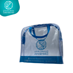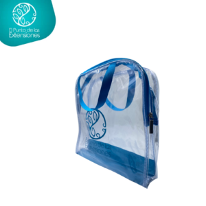 Bolso rectangular con bordes redondeados en material polímero sin color, cierre deslizador de lujo y cargaderas en cinta faya de 18mm