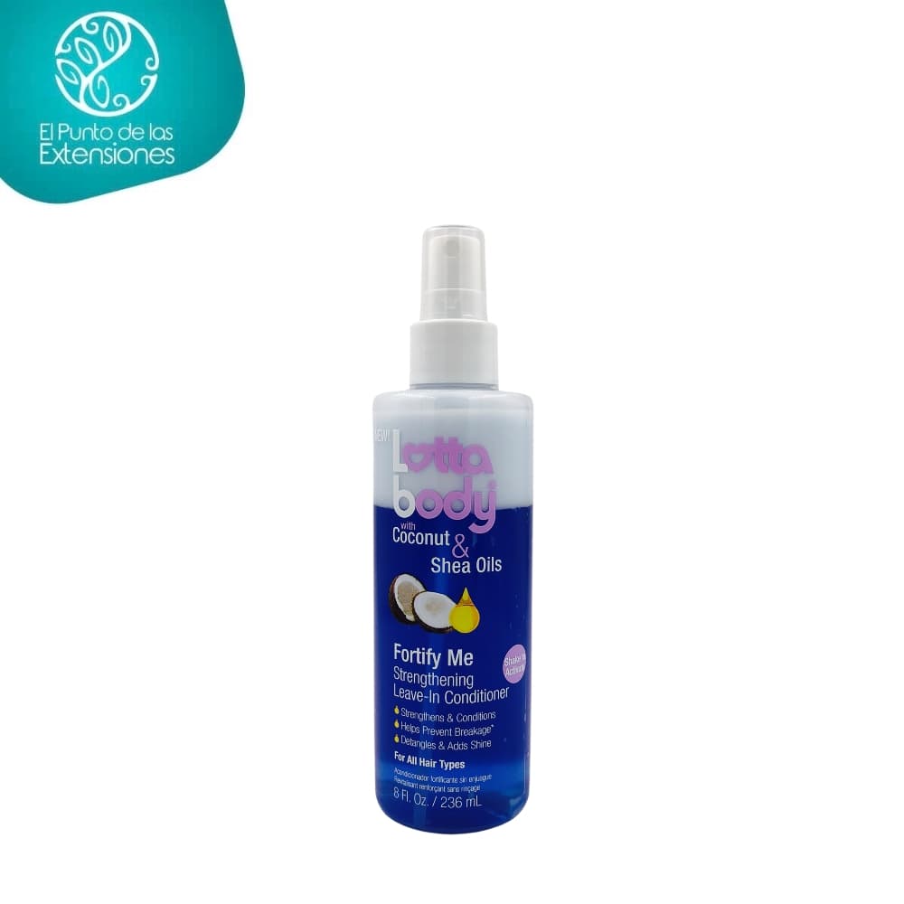 El leave-in acondicionador en spray LottaBody Fortalece Me ayuda a desenredar controlando el frizz fortaleciendo y acondicionando desde el interior. Ideal para todo tipo de cabellos naturales o alisados fortaleciéndolo desde el interior y evitando la rotura. Elaborado con ingredientes naturales como aceite de coco para aportar brillo y suavidad y aceite de karité para hidratar profundamente y proteger el cabello de daños causados en procesos químicos. Fórmula libre de sulfatos, aceites minerales, ftalatos, parafinas, petrolatos ni formaldehído. Hecho en USA.